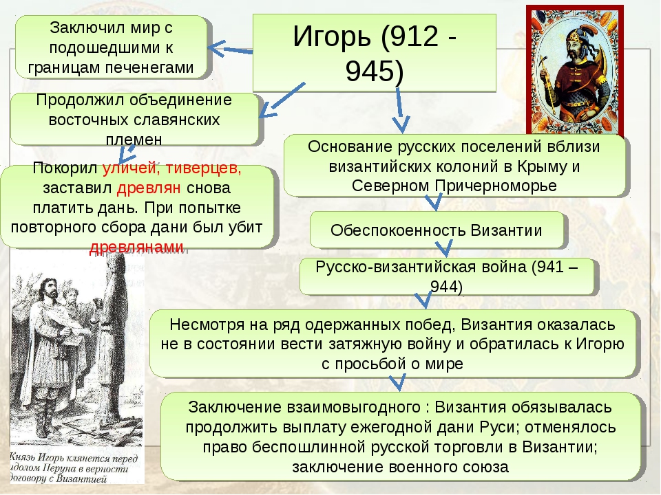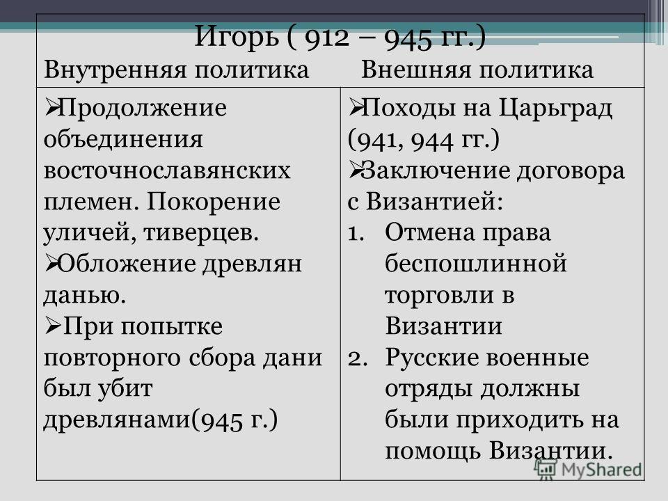 В 912 году к власти приходит Игорь Рюрикович. Молодой князь начинает активно подчинять себе славянские племена на территории Руси. Многие противились подчиниться единому князю, поэтому основой внутренней политики становится укрепление единой княжеской власти. Все племена облагались данью, которую ежегодно лично собирал князь с дружиной.