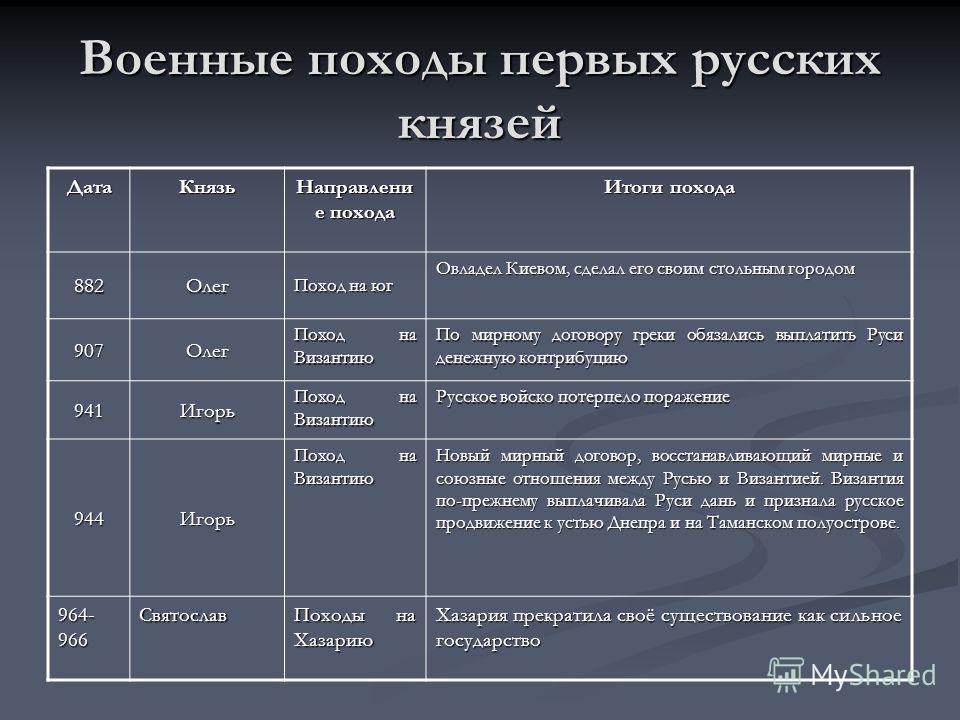 Взаимоотношениям с соседними странами внимания уделялось больше, чем изменениям внутри государства. Главной целью внешней политики в 9-10 веках была Византия. Первый поход совершил еще князь Олег в 907 году и заключил торговый договор с Константинополем, причем зафиксирован письменно. После него дважды в 941 и 944 годах на Византию ходил Игорь. Первый поход оказался неудачным, и весь русский флот был уничтожен “Греческим огнем”. Результатом второго похода стал новый торговый договор между государствами.