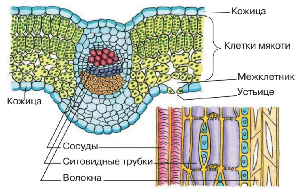 Это сосудисто-волокнистый пучок, образованный ксилемой и флоэмой. Ксилема (сосуды) располагается сверху, флоэма (ситовидные трубки) — снизу. Вокруг пучка в виде кольца располагается механическая ткань – склеренхима — выполняющая опорную функцию. Над пучком и под ним механическая ткань – колленхима.Жилки развиваются из прокамбия, располагаются в центральном осевом цилиндре.
