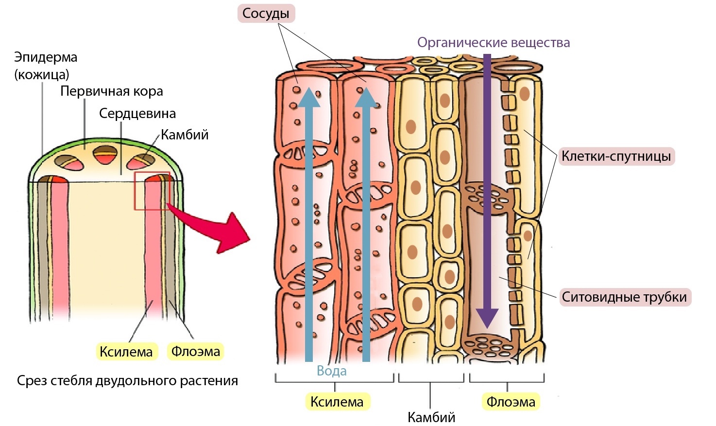 Транспортировка воды и минеральных веществ к листьям; проведение органических веществ от листьев к другим органам. |
