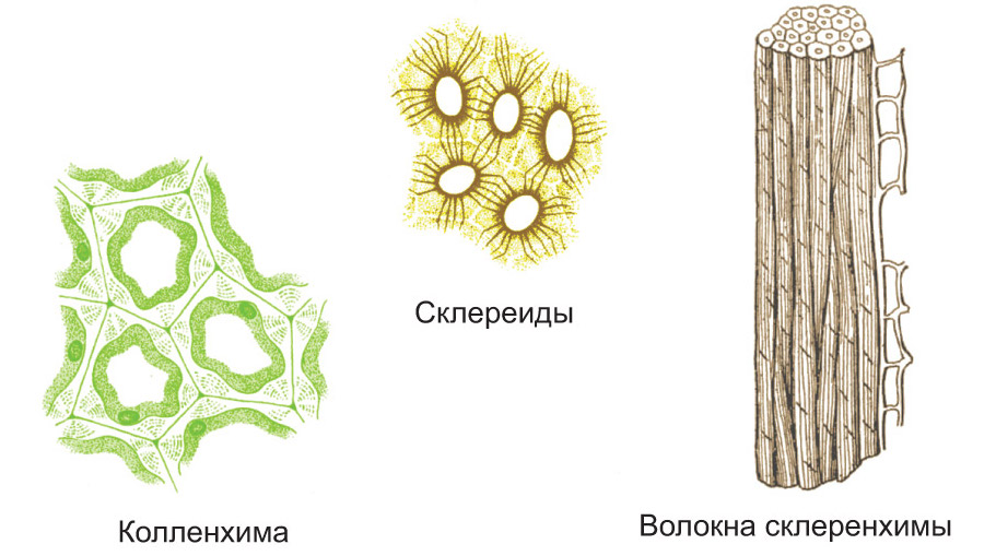 | 1. Колленхима | Живые клетки с неравномерно утолщенными стенками | В первичной коре молодых стеблей | Укрепление молодых растущих органов |