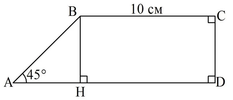 Пусть основания заданной трапеции – это отрезки АD и ВС, ∠А = 45°, ∠D = ∠C = 90°. Опустим из точки В перпендикуляр ВН на АD: