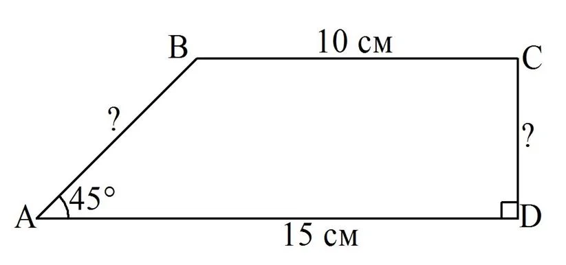 Задание. Основания прямоугольной трапеции имеют длину 10 и 15 см, а один из углов составляет 45°. Вычислите длину ее наименьшей боковой стороны?